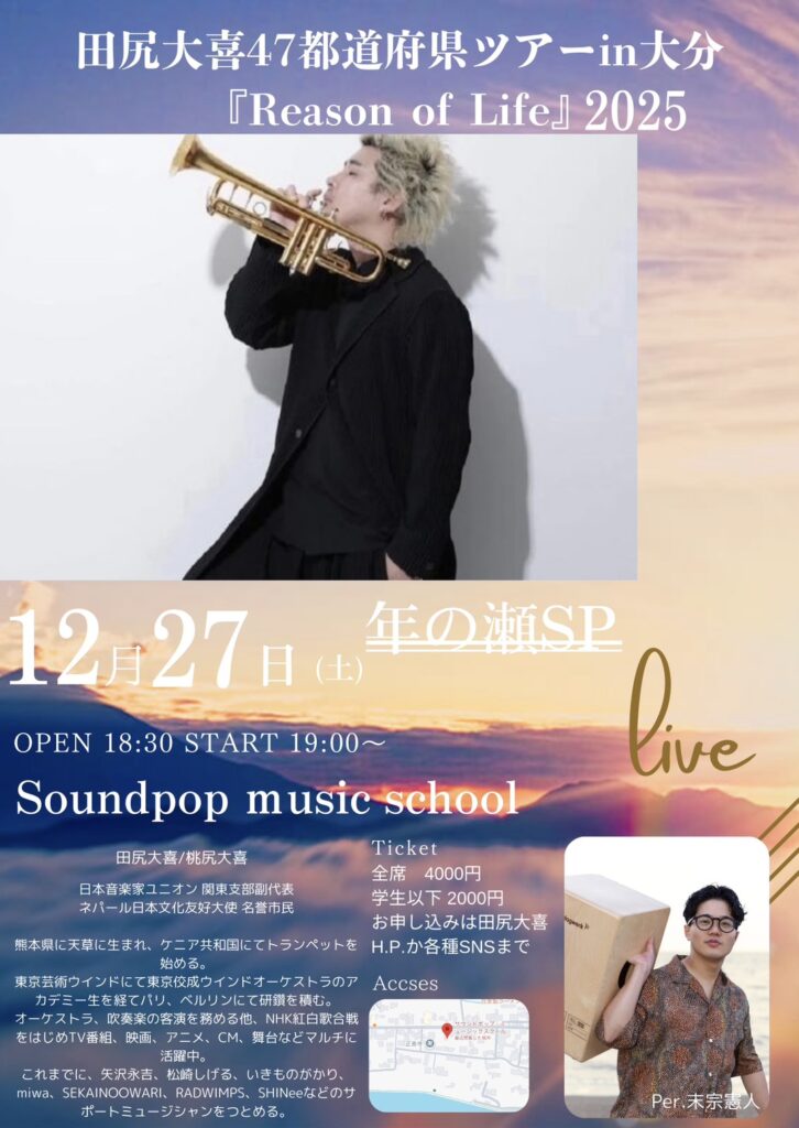 12/27(土) 本教室にてプロトランペット奏者.田尻大喜さんのライブが開催されます。田尻さんは葉加瀬太郎さんと共演したり、矢沢永吉さんやいきものがたりさんの演奏をサポートされたりする名プレイヤー、去年も本教室で演奏してくれたのですが、非常に魅力的なサウンドでした。